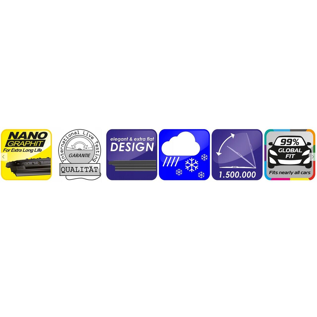 Lamela este 100% din cauciuc natural si este acoperita cu particule de NANO GRAPHIT care nu lasa dungi, nu lasa pete si ofera o vizibilitate excelenta pe tot parcursul anului indiferent de conditiile meteorologice. Tot datorita acestui invelis grafitat, lamela este mult mai flexibila si durabila. Este ideal pentru iarna datorita rezistentei la inghet a stergatorului fara rama.