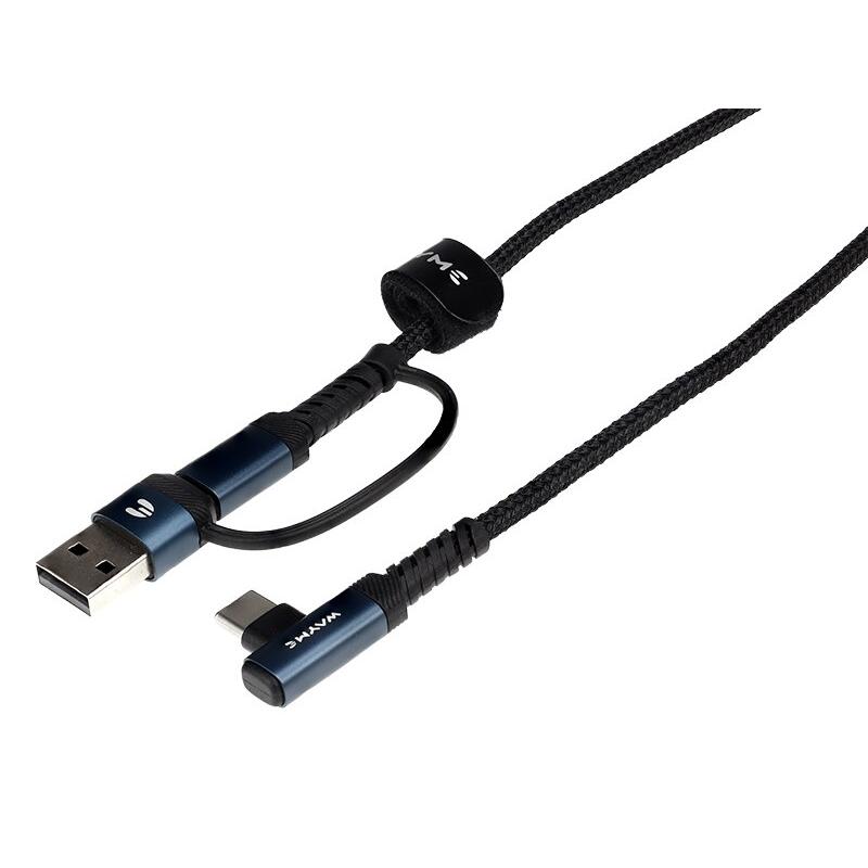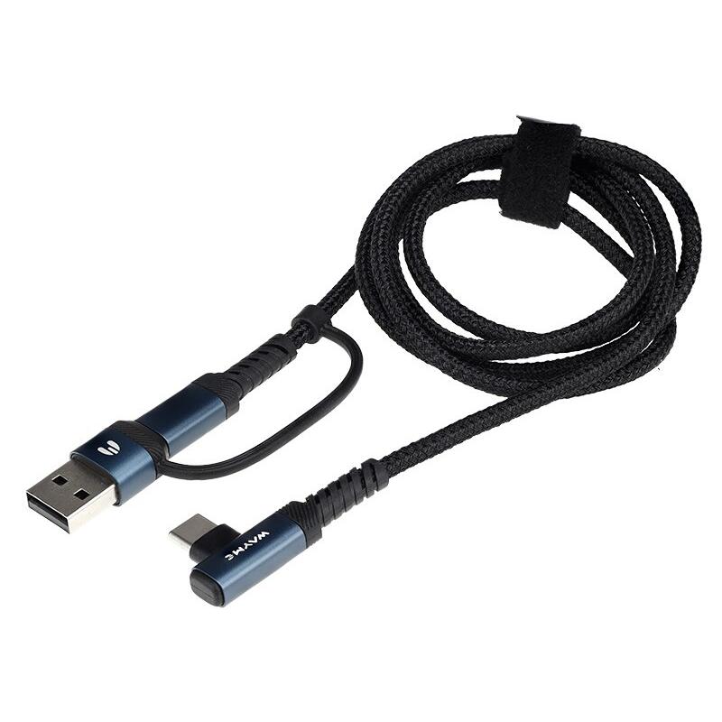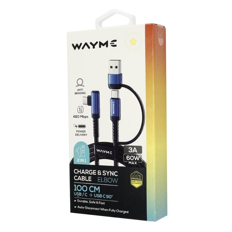Cablu 2-în-1 pentru încărcare și transfer date, compatibil USB și USB-C către USB-C cu suport Power Delivery până la 60W și 3A. Conectorul în unghi 90° și protecția textilă cresc rezistența la utilizare zilnică și reduc stresul mecanic pe port.