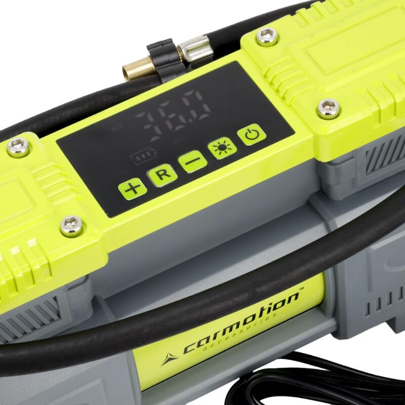 Compresorul auto Carmotion 63341, 12V, cu două pistoane și debit 60 L/min, oferă o presiune de până la 10 bar (150 PSI) și permite setarea presiunii țintă, cu oprire automată la atingerea valorii alese.