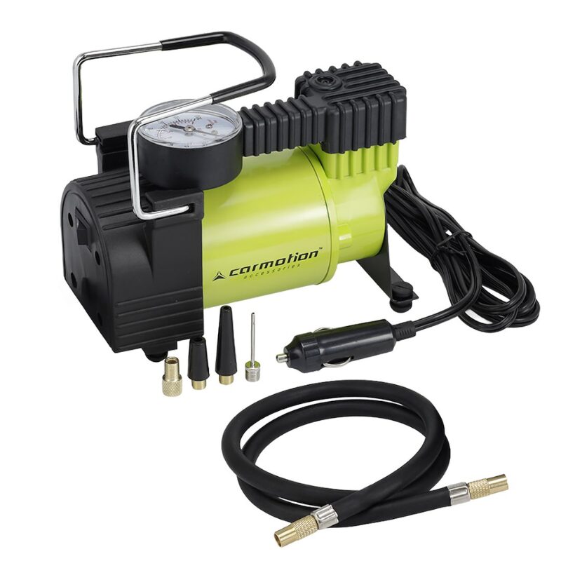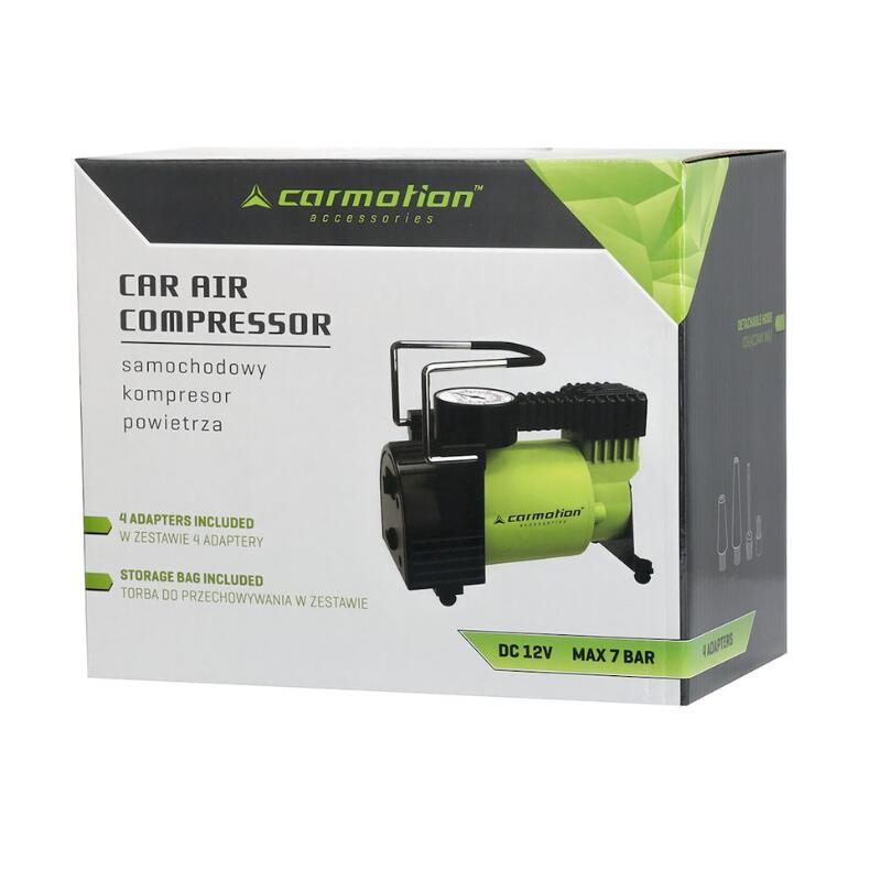 Compresor aer auto 12V Carmotion 58004, cu presiune maximă de 11 bar și debit de 35 l/min, destinat umflării rapide a anvelopelor și altor articole gonflabile. Este echipat cu manometru analogic și vine cu adaptoare multiple pentru utilizare variată.