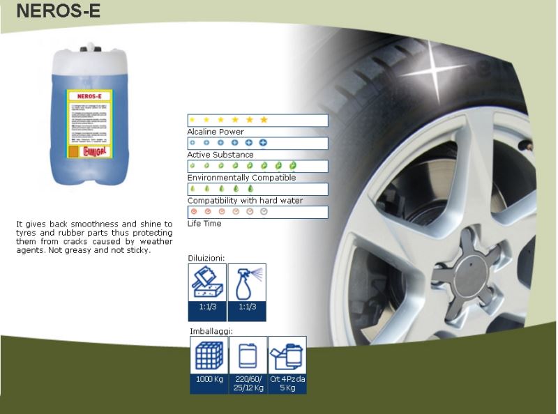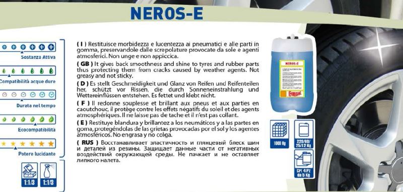 NEROS E este un produs conceput pentru a readuce luminozitatea si netezimea tuturor tipurilor de cauciuc. Componentii speciali permit partilor tratate sa ramana stralucitoare pentru mai multe zile. In plus ajuta la prevenirea efectelor negative provocate de soare sau alte conditii meteorologice nefavorabile.