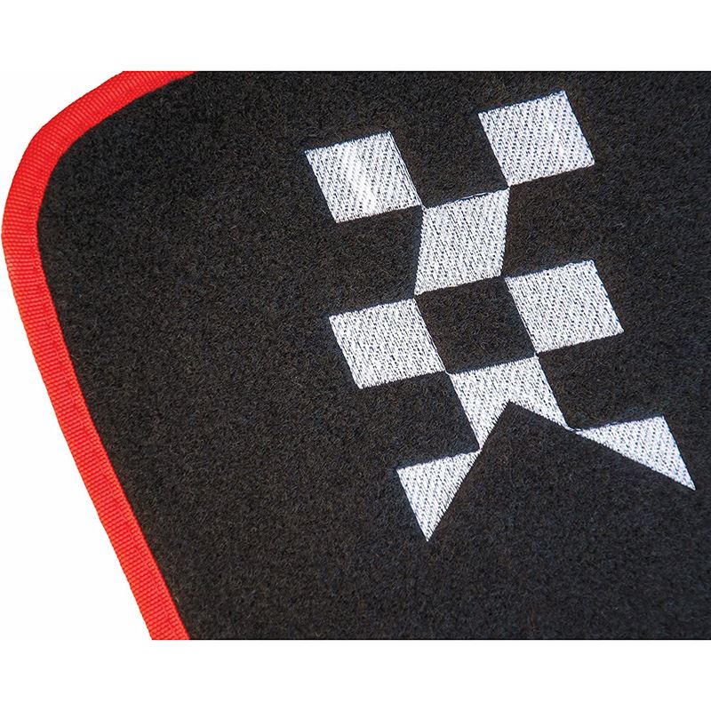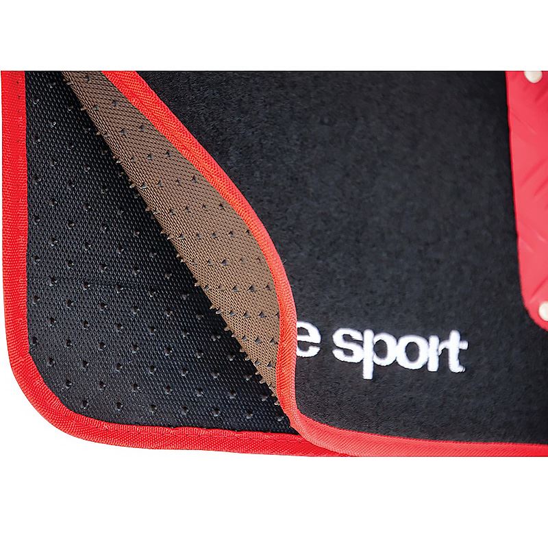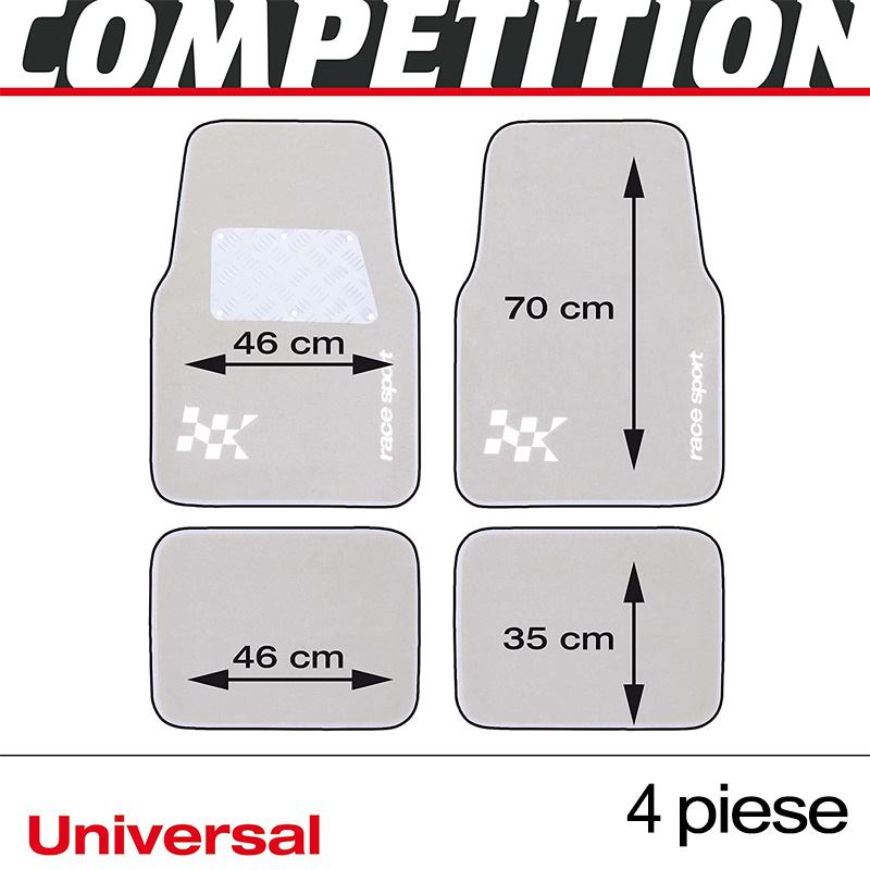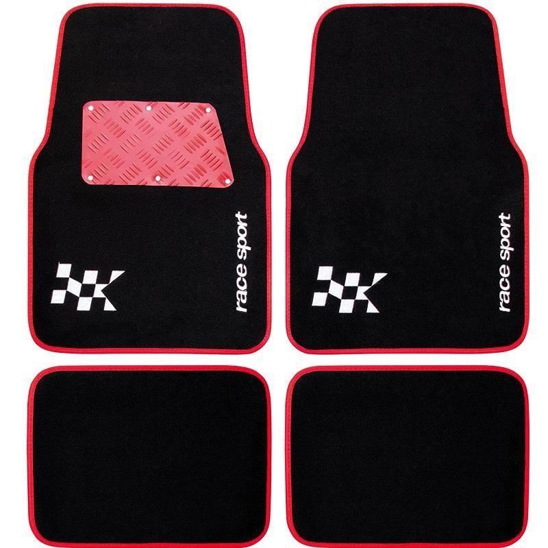 Set de covorașe auto universale RaceSport AFT3000, realizate din mocheta rezistentă, cu dimensiuni de 70x46cm, ideale pentru protecția interiorului mașinii.Covorașele au întăritură din aluminiu roșu în zona călcâiului, conferindu-le un aspect sportiv și o rezistență sporită la uzură.