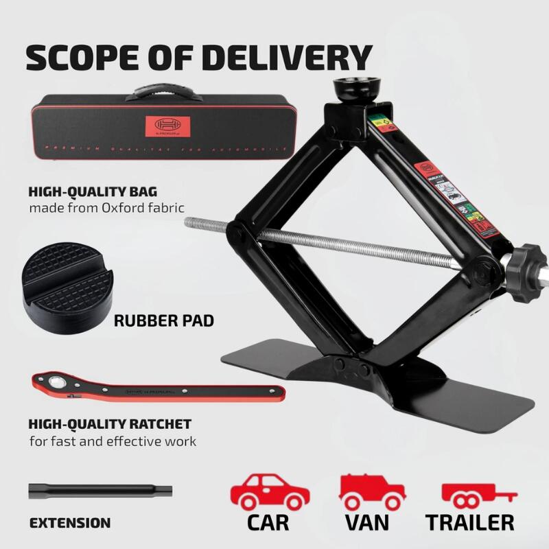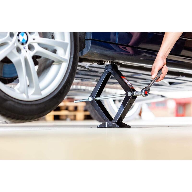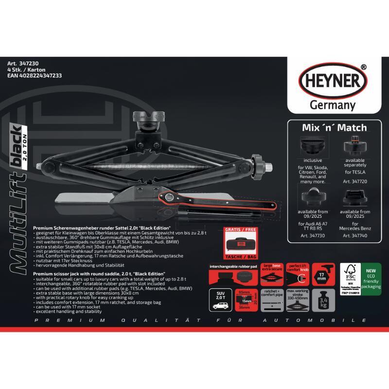 Cric foarfecă robust cu acționare manuală, capacitate 2T, dotat cu bază extra-lată și cheie cu clichet pentru ridicare rapidă și sigură, parte din seria „MultiLift Black Edition” HEYNER Germany.
