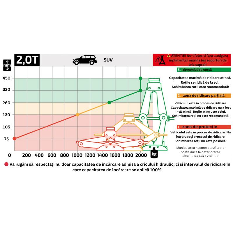 Atentie! Potrivit pentru vehicule a caror greutate se ridica pana la 2,0T. Este nu numai important sa respectați capacitatea de incarcare admisa a cricului, dar si domeniul de ridicare pentru care capacitatea de incarcare se va aplica la 100%. Utilizarea necorespunzatoare poate duce la vatamari grave sau la deteriorari.