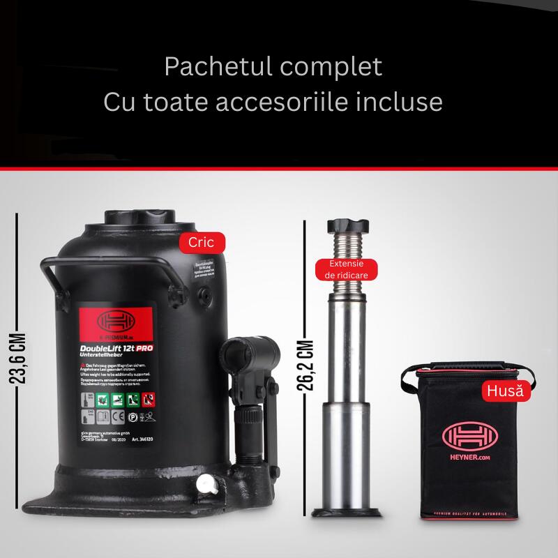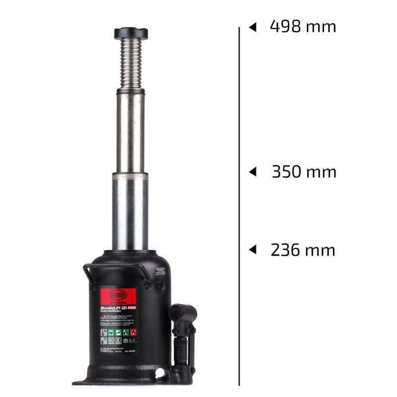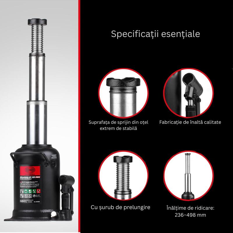 HEYNER DoubleLift 12T PRO este un cric hidraulic cu piston dublu cromat, sistem de ridicare în 3 trepte și interval de lucru 236–498 mm, conceput pentru vehicule grele și operațiuni precise de ridicare.