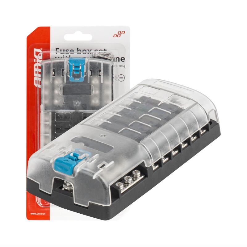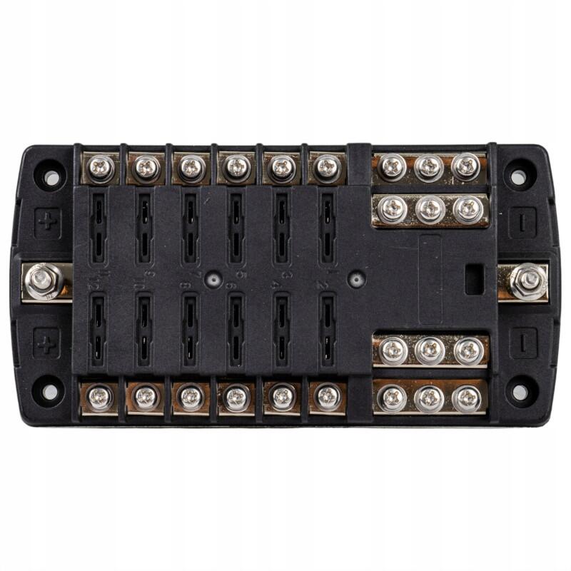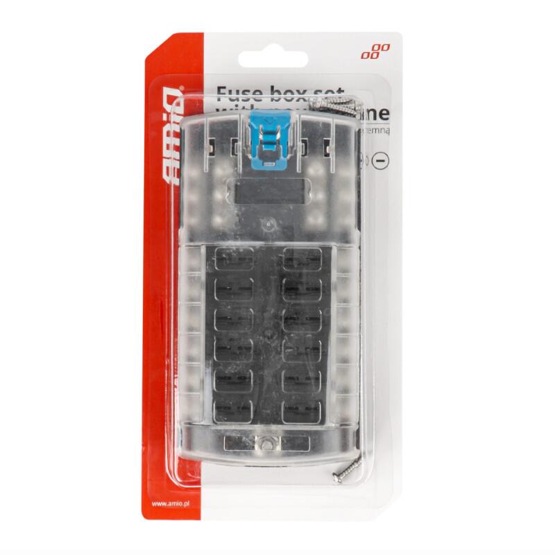 Cutie sigurante plate cu 12 circuite CC, maximum 30A, linie conexiune negativa, capac protectie, 03834 Amio.