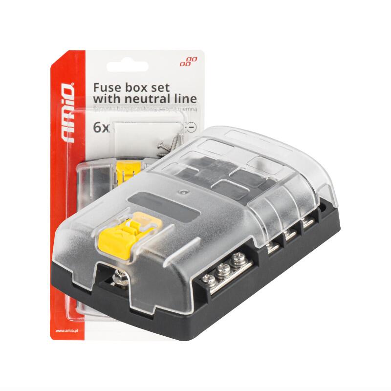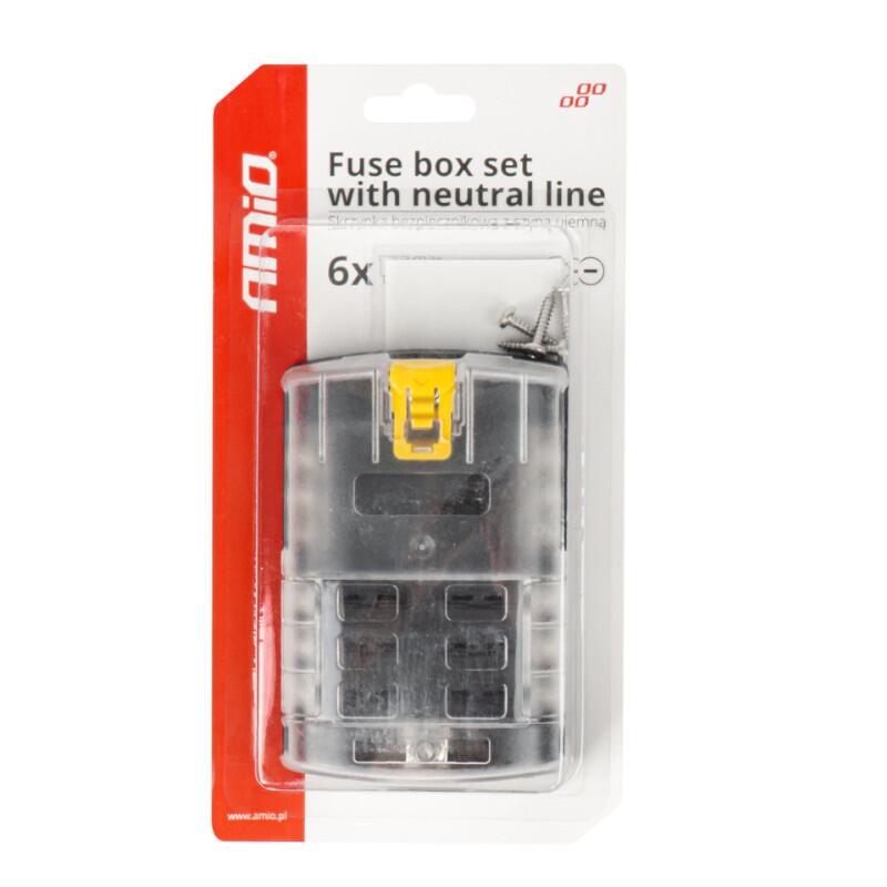 Cutie sigurante plate cu 6 circuite CC, maximum 30A, linie conexiune negativa, capac protectie, 03833 Amio.