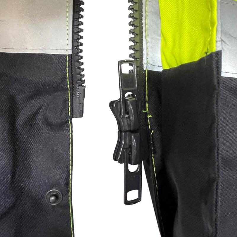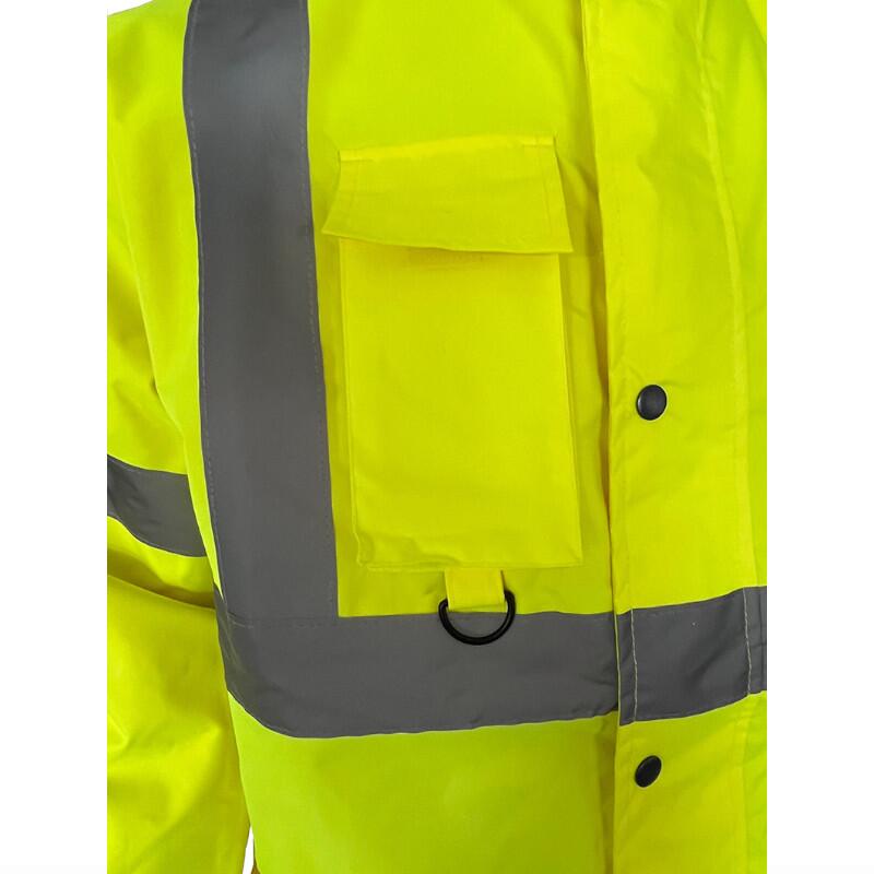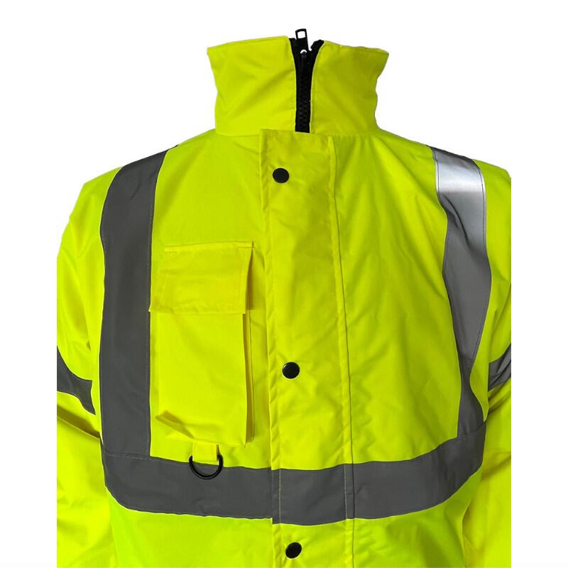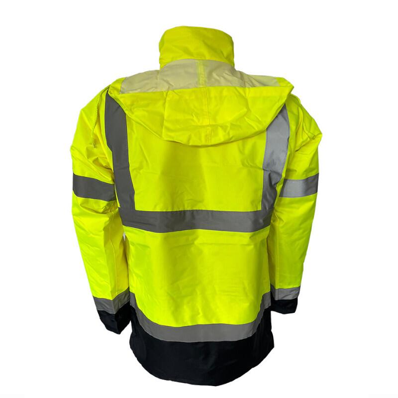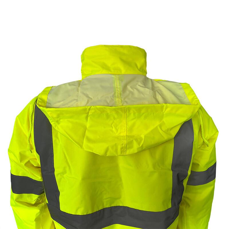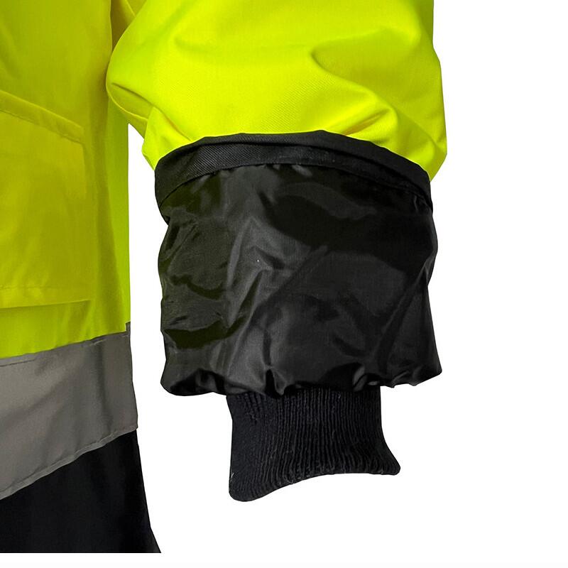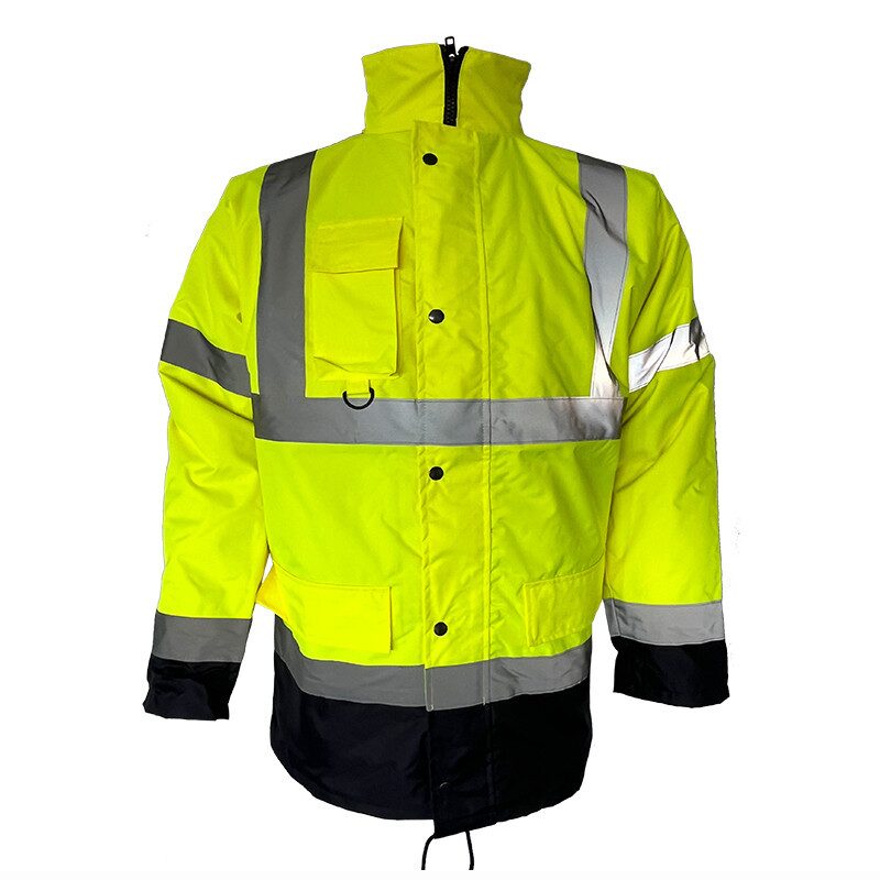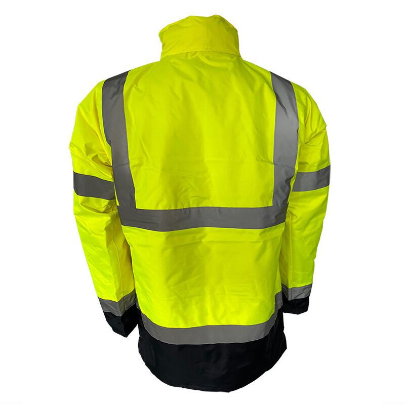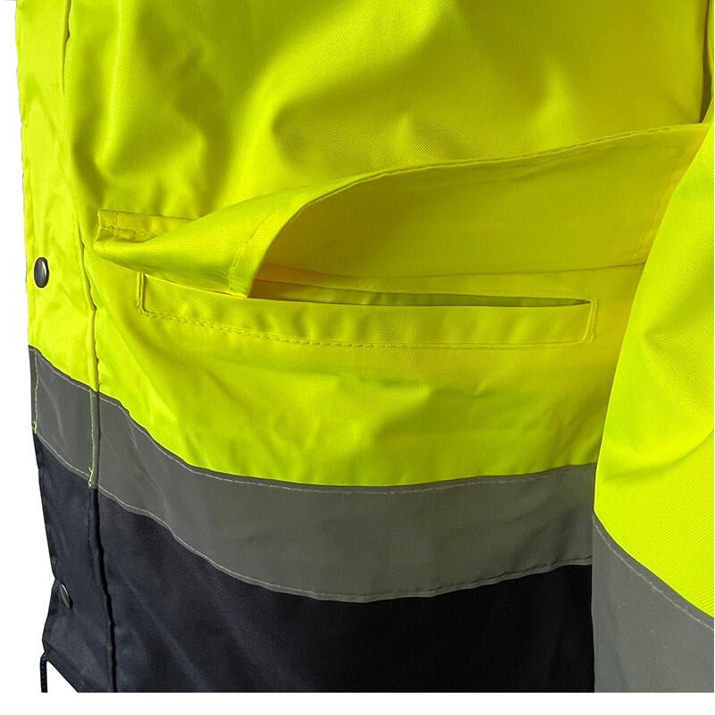Jacheta izolata lunga din material fluorescent cu benzi reflectorizante.