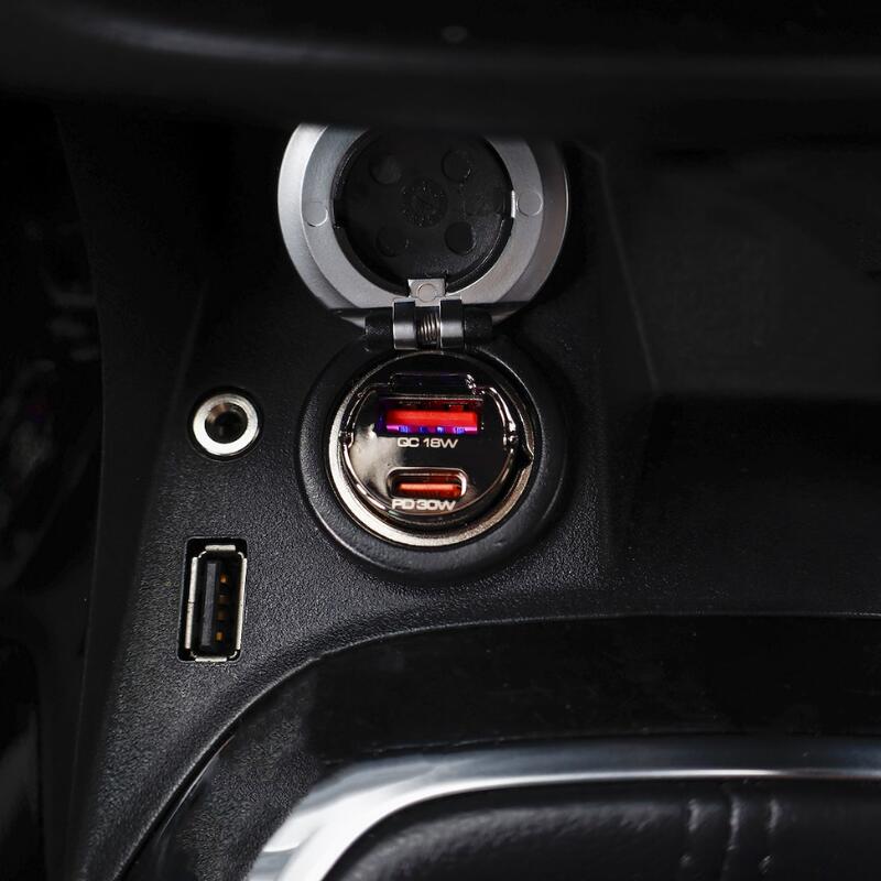 Încărcător auto cu 2 porturi USB, USB-A 18W + USB-C PD 30W, 12–24V, nano scurt cu inel, WAYME 63055.