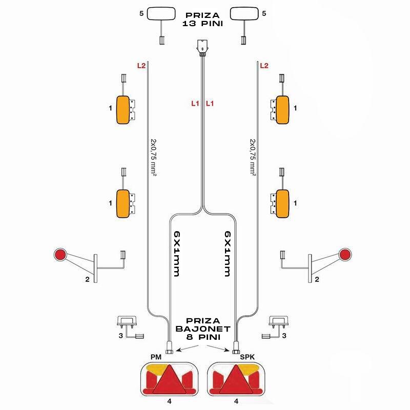 Instalatie electrica cablaj remorca cu Fisa 13pini si 2 mufe cu 8pin, cablu 2x7m si 2x5m IDP/7,0m/5.0m/13PIN/8PIN.