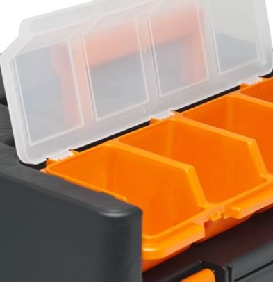 Un compartiment mare în interior (plus 4 compartimente mai mici) și un sertar independent (detașabil cu 4 compartimente fixe și capac transparent), în care poți depozita atât unelte mai mari, cât și elemente mai mici precum articole de pescuit, lego, accesorii electrice, ș.a.m.d..