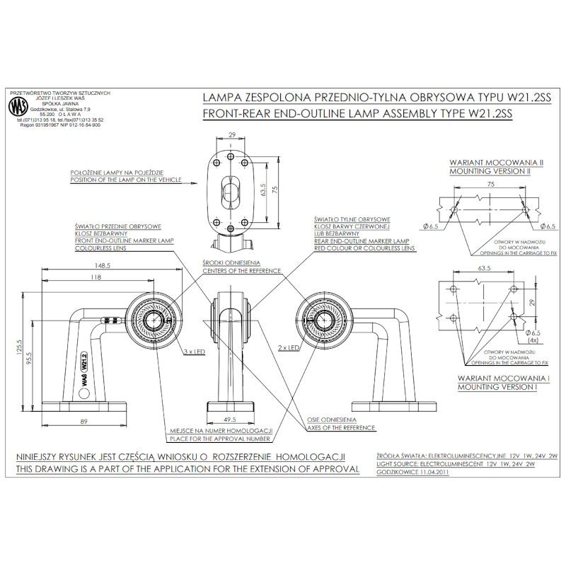 Lampa gabarit cu brat cotit la 90°,125mm, LED, alb-rosie, stanga, 12-24V, W21.2SS 421L Was