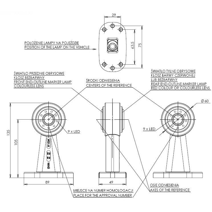 Lampa gabarit cu brat 135mm, LED, alb-rosie, angeleye, 12-24V, W21.6ww 509bc Was