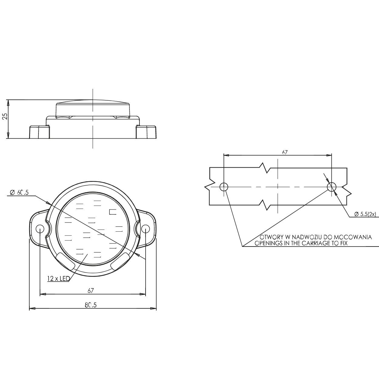 Lampa stop fi60, LED, mers inapoi, prindere cu 2 urechi 1531 AR Was