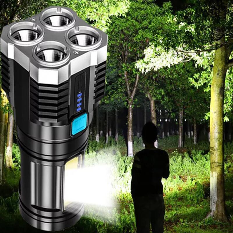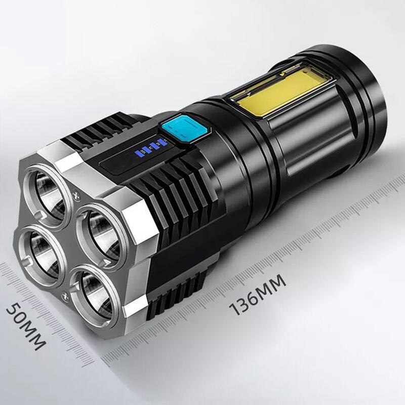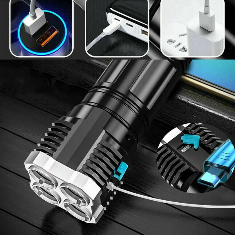 Sursa de lumina a lanternei reincarcabile este compusa din 4 led-uri puternice Huit-Core P1000, lumina este stralucitoare, iar distanta de iluminare este lunga, acoperind o zona larga, de pana la 500 de metri. Lanterna rezistenta la apa cu rating IPX4 va poate oferi o vedere clara in intuneric pentru a imbunatati siguranta deplasarilor pe timp de noapte;