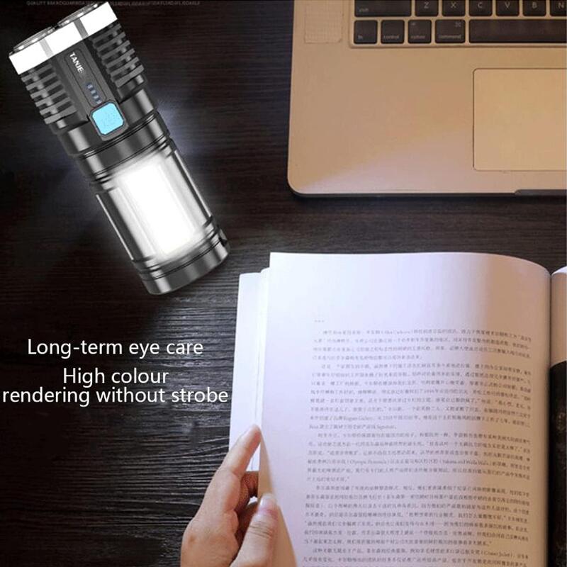 Poate fi utilizata ca proiector, lumina de camping, lumina de lucru, etc. Exista, de asemenea, 4 moduri: iluminare puternica, iluminare redusa, proiector COB si mod de blit. Atunci cand cititi carti, puteti seta lanterna in modul de proiector COB, care are redare inalta a culorilor si nu are clipiri;