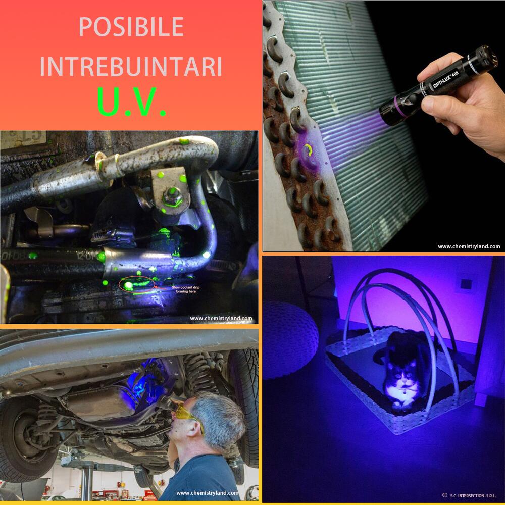 Utilizari ale lampi UV: detectarea scurgerilor auto in special a freonului, descoperirea si cautarea materialelor cu efecte fluorescente, detectarea petelor de fluide umane in camerele de hotel, detectarea petelor de urina in cazul animalelor de companie, detectarea de uleiuri si grasimi, detectarea autenticitatii bancnotelor, vizualizarea stampilelor invizibile, facturilor si a chitantelor originale, verificarea autenticitatii biletelelor, invitatiilor, tichetelor securizate, iluminarea oricarui fel de substanta fluorescenta; cercetari geologice, detectarea unor substante ce contin microbi, periculoase pentru organism.