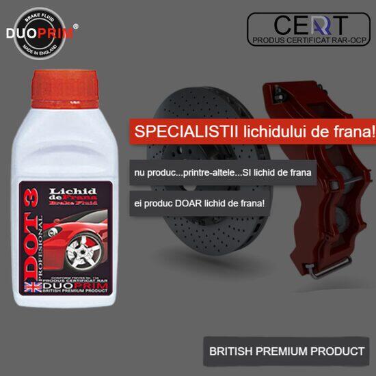 Lichid de frână și ambreiaj Duoprim DOT3, 230 ml, compatibil cu specificațiile internaționale DOT3, cu stabilitate bună la temperaturi ridicate și formulă pe bază de poliglicoli.