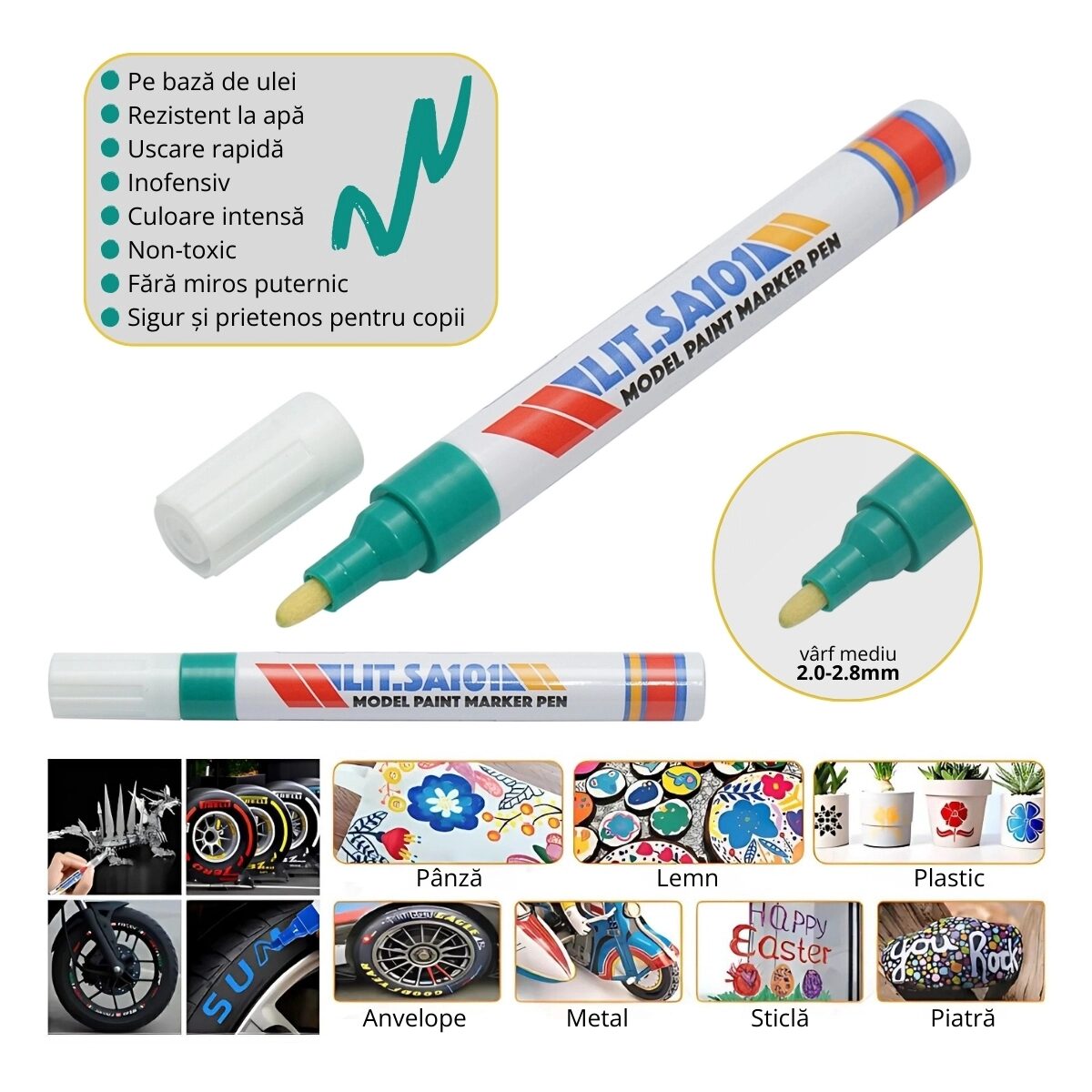 Setul conține 12 markere verzi pe bază de ulei, concepute pentru aplicare pe diverse suprafețe, cu următoarele caracteristici: