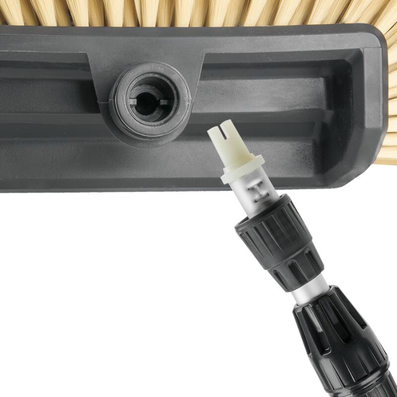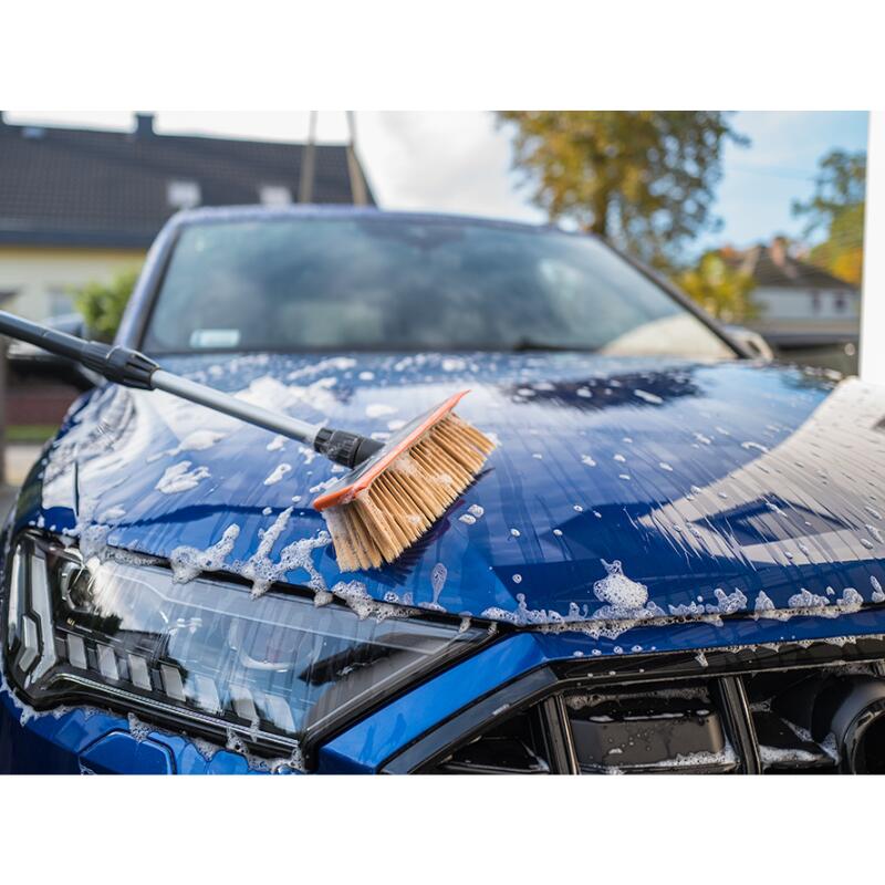 Perie de spălat cu supapă SOFT, cu cap dublu pe 2 planuri și mâner telescopic din aluminiu reglabil între 180 și 300 cm. Ideală pentru spălarea autoturismelor, autoutilitarelor, rulotelor și suprafețelor exterioare din jurul casei. Perii moi protejează vopseaua, iar supapa integrată permite controlul precis al debitului de apă.