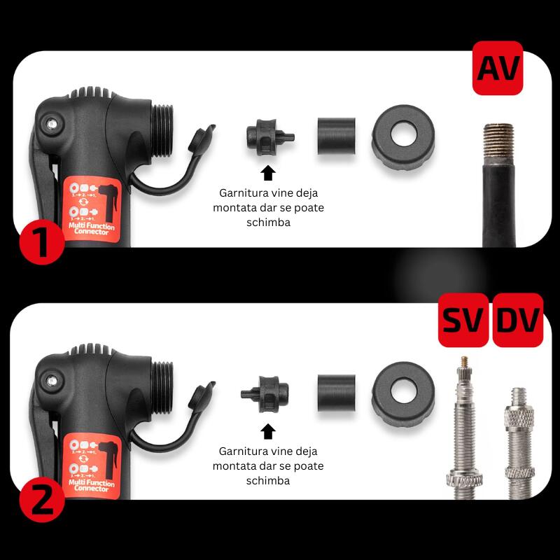 Valve compatibile: Schrader (AV), Presta (SV), Dunlop (DV);