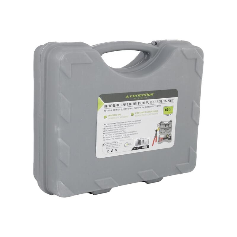 Kitul cu pompă de vid manuală este conceput pentru aerisirea sistemelor de frânare și pentru diagnosticarea rapidă a componentelor motoarelor diesel și benzină. Cu ajutorul manometrului și accesoriilor incluse, permite verificarea funcționării corecte a sistemelor de alimentare, presiune și vacuum, fiind compatibil cu majoritatea autoturismelor.