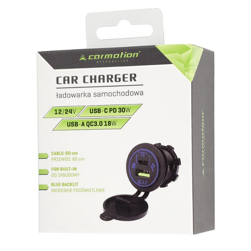 Priza cu 2 USB-uri, USB + USB-C, 12-24V, QC 3.0, Led albastru, cu cablu 60 cm, cu siguranta, Carmotion 63211