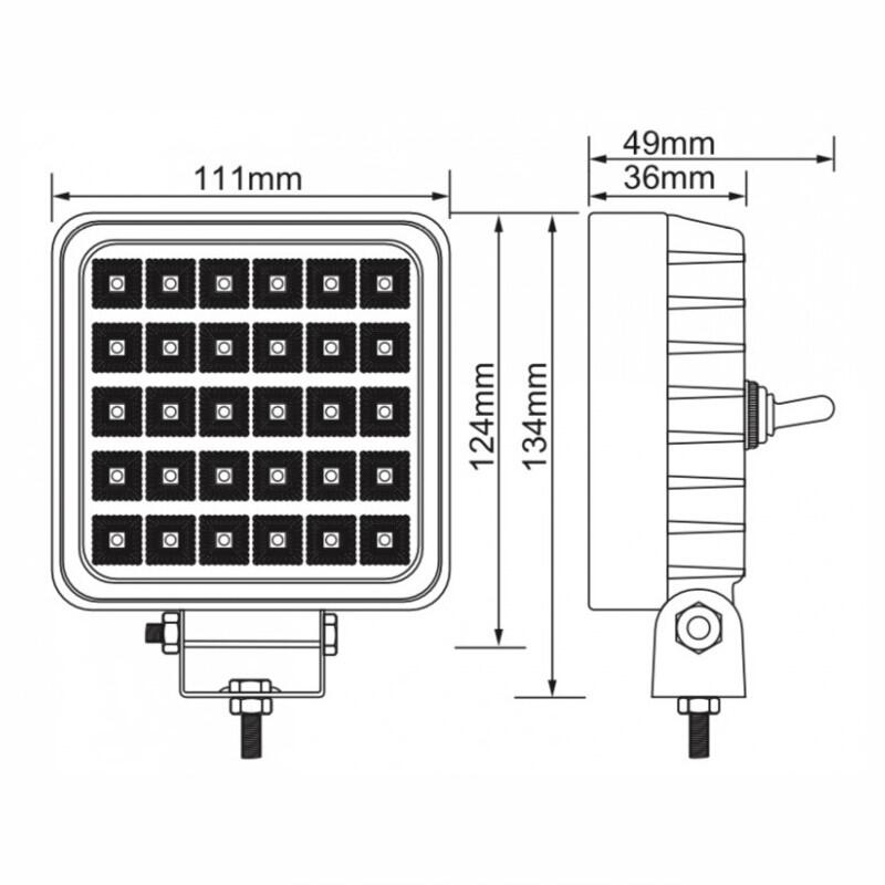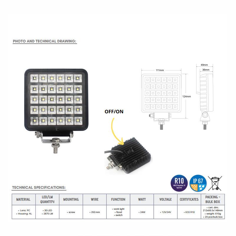 Proiector lucru 111x111, LED, 12-24V, 24W, 2875lm, flood, cu intrerupator, L0156 TruckLed.