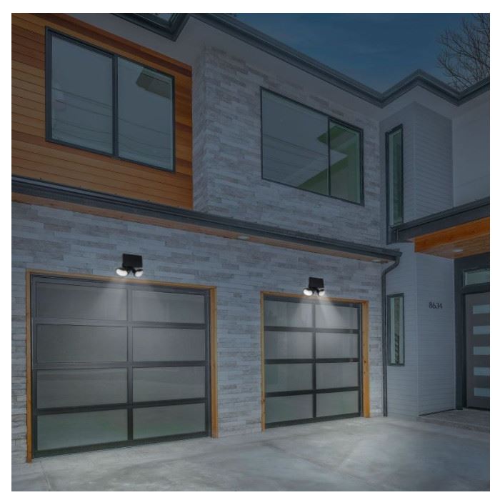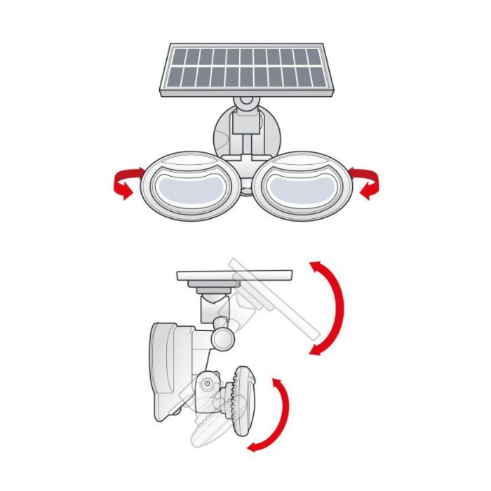 Reflector de perete cu detector de miscare. Doua LED-uri COB rotative, de inalta performanta si o unitate solara de capacitate crescuta asigura iluminarea.