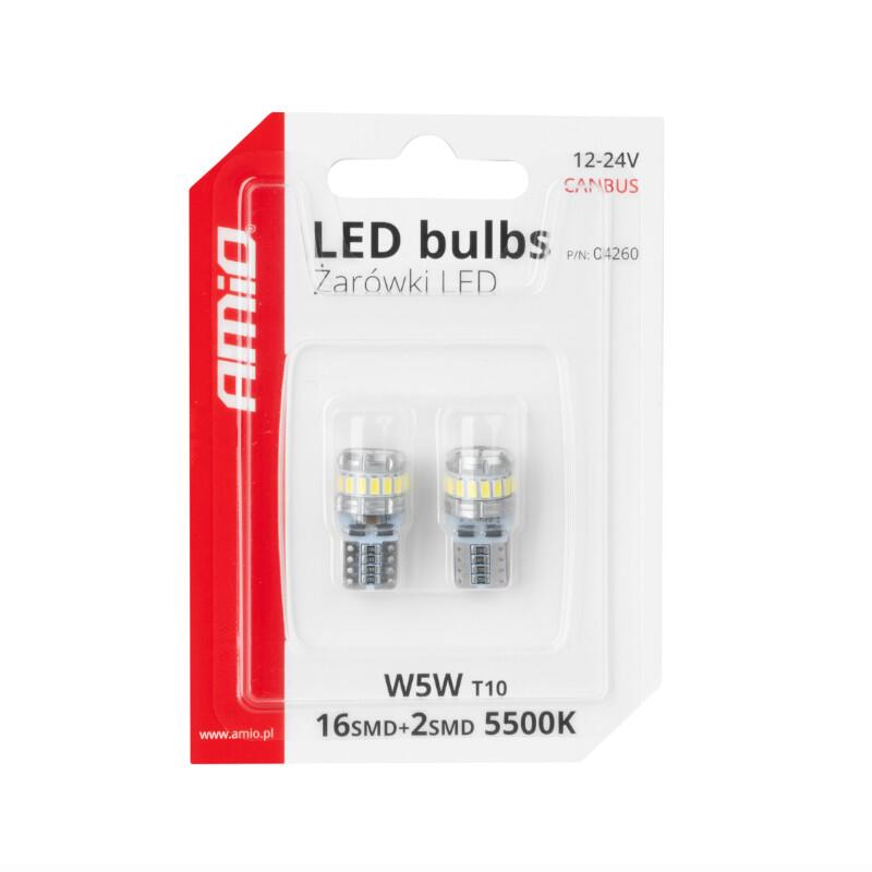 Set 2 becuri T10, 18 LED-uri, SMD 3014, 12-24V, W5W, 5500K, Canbus, alb, 04260 Amio.