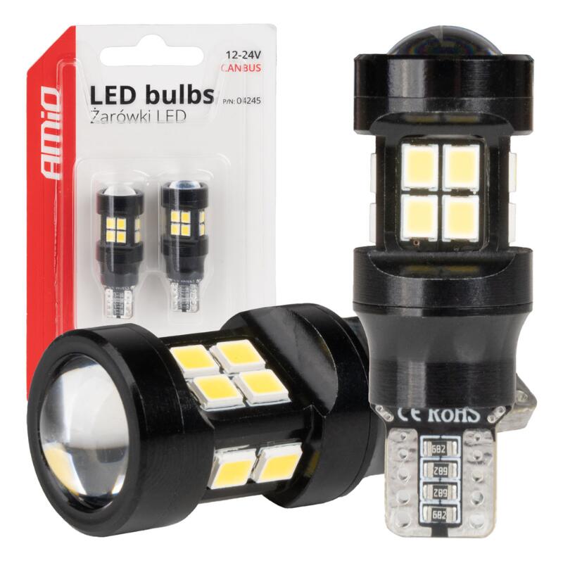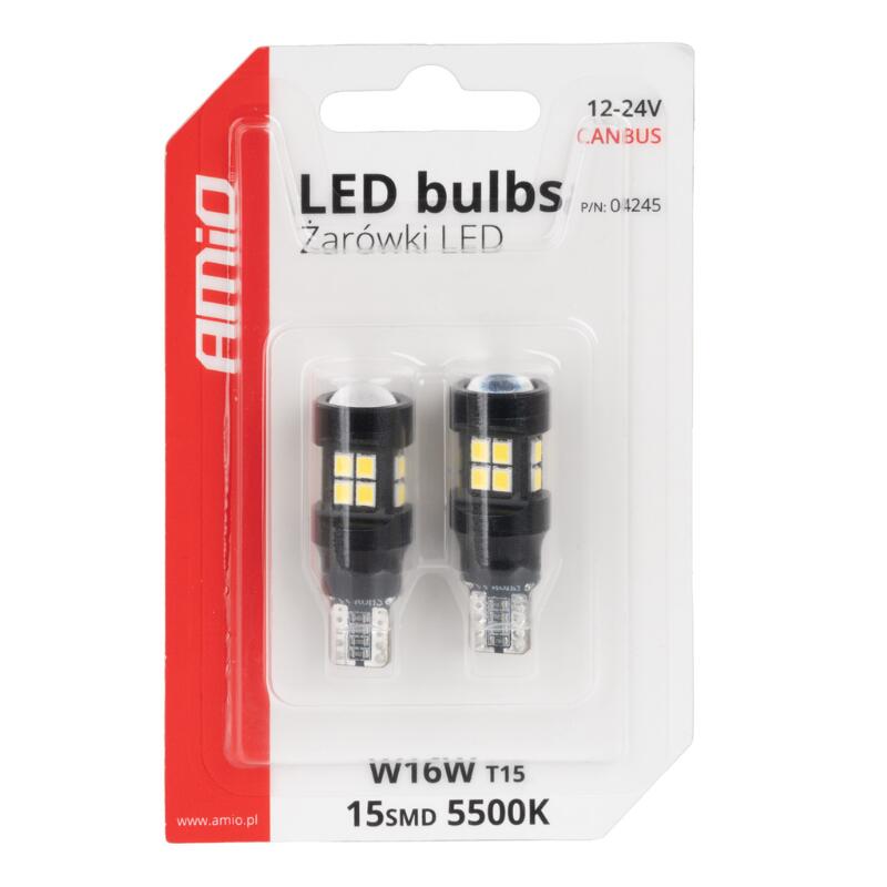 Set 2 becuri T15, 15 LED-uri tip SMD 2835, 12/24V, W16W, CANBUS, Amio 04245.