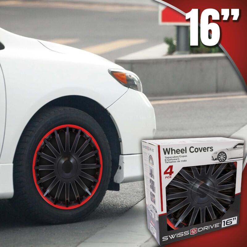 Set 4 capace roti 16inch, negre cu dunga rosie, Florida, VNJ4216 SwissDrive.
