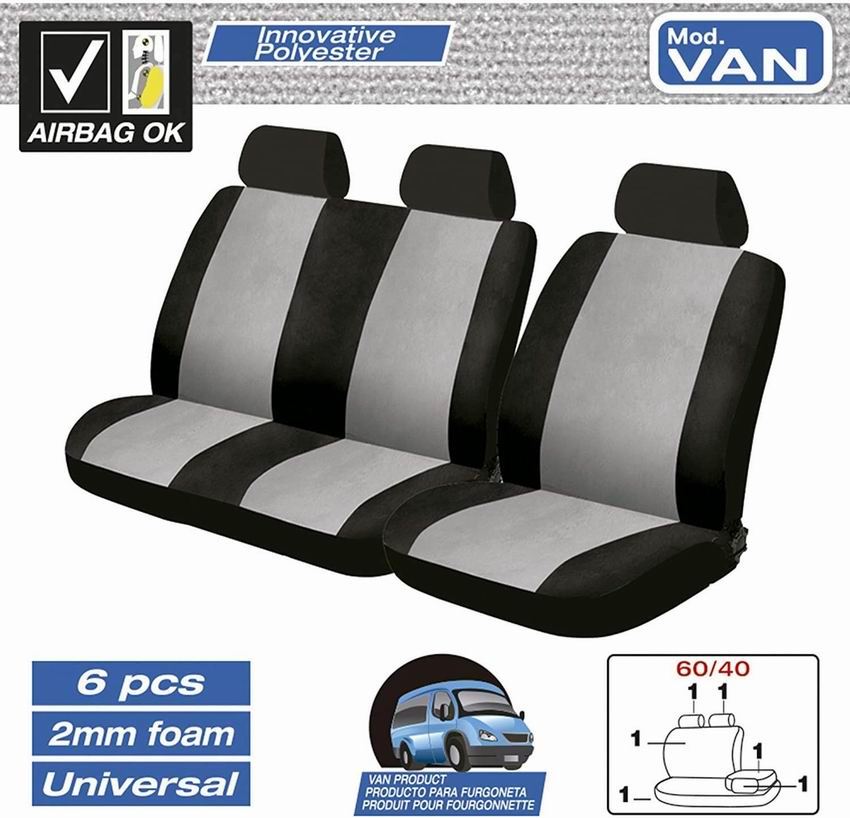 Setul de 6 huse din poliester inovativ imbunatatite cu un strat de spuma de 2 mm, sunt create pentru a se potrivi oricarui autovehicul tip microbuz cu trei locuri in fata.