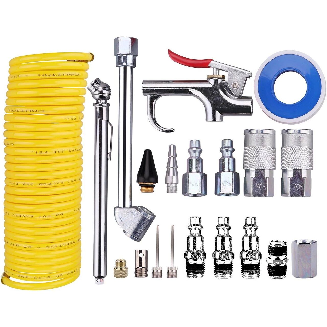 Set accesorii compresor aer, 20 piese, cu furtun spiralat, pistol suflare, conectori, duze și cuple rapide universale, RK49