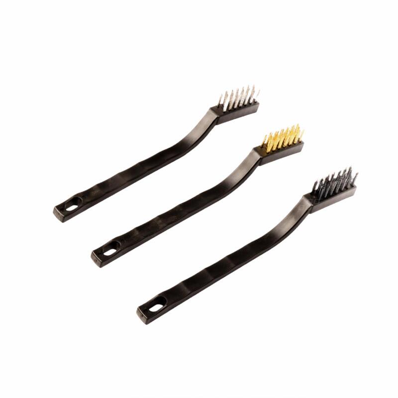 Set de trei perii tehnice din sarma de otel galvanizata, sarma de alama si nailon. Corpuri de perie din plastic dur. Lungime 170 mm.