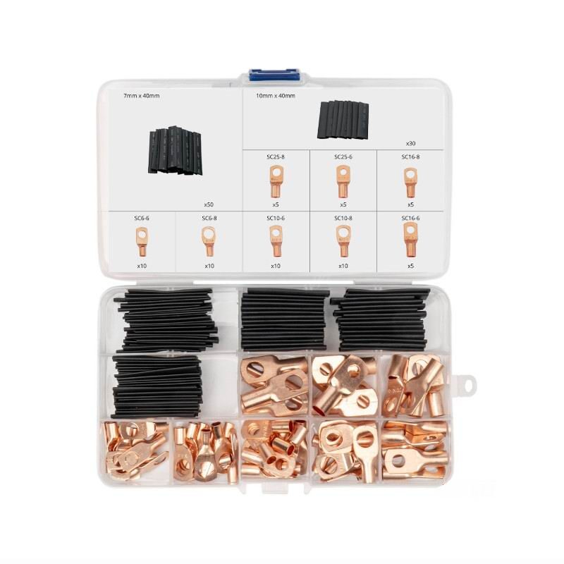 Kit multifunctional - Kitul contine 80 de mansoane termocontractabile si 60 de conectori cu ochiuri, oferind o solutie completa pentru conectarea firelor in instalatiile electrice si electronice.