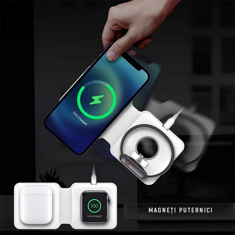 Acest incarcator wireless este partenerul perfect, indiferent daca sunteti in miscare sau acasa la birou. Cu compatibilitate pentru telefoanele iPhone, castile AirPods si ceasurile inteligente Apple Watch, va asiguram ca acesta nu va va dezamagi. Chiar si in calatorii, datorita dimensiunilor compacte, incarcatorul nu ocupa mult spatiu pe noptiera si poate incapea cu usurinta in buzunarul lateral al valizei.
