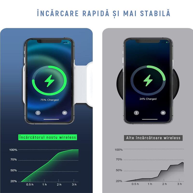Cu acest incarcator wireless, veti experimenta o solutie eficienta si comoda pentru incarcarea dispozitivelor dvs. Apple preferate.