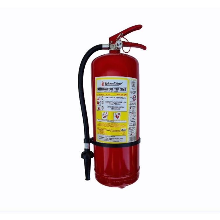 Stingator SM6 de vanzare pentru incendiile provocate in unitati industriale, birouri, centrale telefonice, spitale, supermarketuri, hoteluri, restaurante, magazine de haine, etc. Extinctorul SM6 creeaza un strat de spuma deasupra focului care are rolul de a stinge incendiul, reduce fumul si raceste suprafata incendiata.