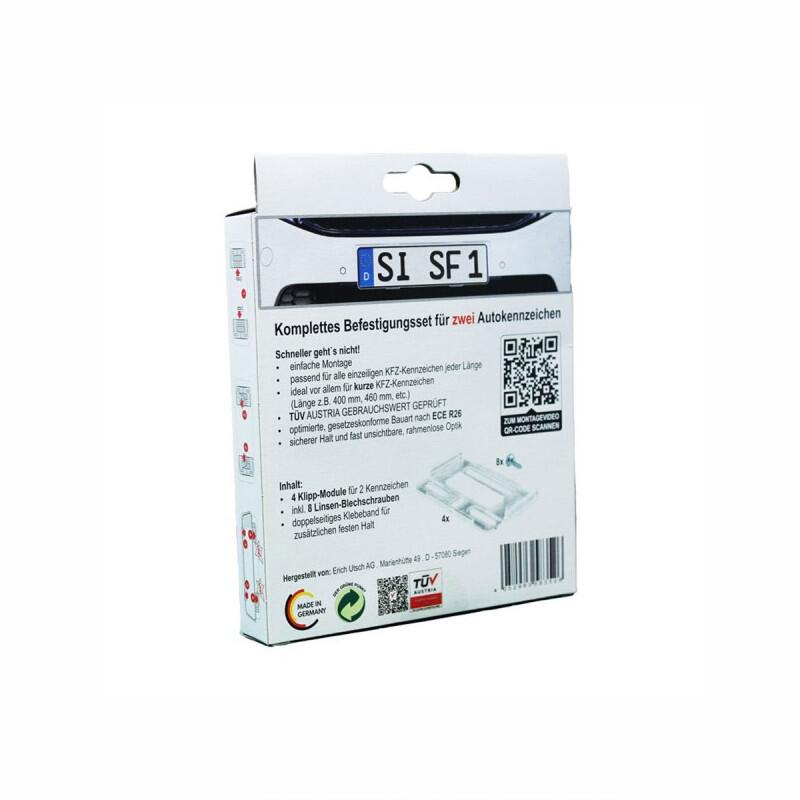 Noul kit de montare universal Simple-Fix ofera posibilitatea optima de montare simpla a placutelor de inmatriculare in fata si in spate, fara gauriri inutile, dar este simplu si fara cadru - aproape invizibil intr-un design transparent, testat de TUV!