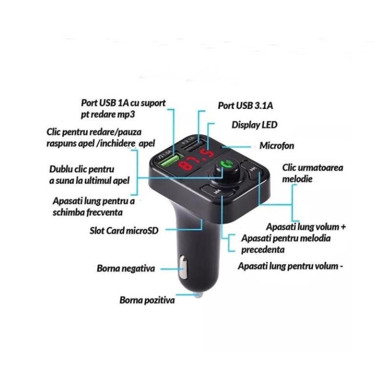 Transmițător FM F6 cu Bluetooth, MP3 și funcție handsfree, alimentat la 12–24V, ideal pentru redare audio și încărcare rapi...
