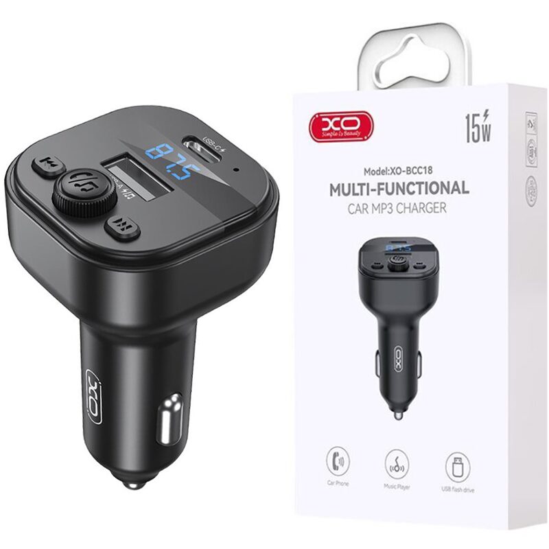 Transmițător MP3 auto XO-BCC18-C cu Bluetooth integrat, funcție handsfree și încărcare rapidă 15W, destinat redării audio și apelurilor direct prin sistemul radio al mașinii.